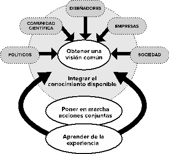 Como se enfatizó, el marco de acción sobre el cual se fundamenta la complejidad supone concebir el objeto de estudio como un sistema complejo. “Se trata, en primera instancia, de una metodología de trabajo interdisciplinario, pero es, al mismo tiempo, un marco conceptual que fundamenta, sobre bases epistemológicas, el trabajo interdisciplinar” (García, 2006: 39). Dicha investigación interdisciplinar requiere del análisis de tales sistemas donde están involucrados el medio físico-biológico, la producción, la tecnología, la organización social y la economía. A través del trabajo inter-transdisciplinar se obtiene una visión en común que integra el conocimiento disponible entre los diferentes actores (comunidad científica, políticos, empresas, diseñadores, sociedad en general, etc.), que contribuye a poner en marcha acciones conjuntas, desde diferentes enfoques y pluralidad de saberes, lo cual posibilita el proceso de aprender de la experiencia compartida como se aprecia en la figura 5.