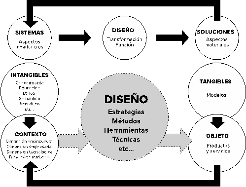 En tal sentido, Hernandis (2016: 34) considera que para una mejor “gestión de lo intangible para optimizar el diseño de lo tangible, es decir, de los productos y servicios demandados por la sociedad” es crucial tener en cuenta un conocimiento existente sobre la noción sistema, que produce inevitablemente otros enfoques inherentes al proceso de diseño, surgiendo así, diversas estrategias y soluciones palpables. En otras palabras, el diseño complejo sugiere potenciar los intangibles como la gestión del conocimiento, considerando las dimensiones del contexto, lo cual genera nuevos planteamientos implícitos, nuevas formas de aproximación y simulación de sistemas, así como la aplicación de estrategias encaminadas a optimizar el diseño de lo tangible, a través de la modelización de soluciones materiales sostenibles, esto como una vía para abordar la complejidad creciente mediante la intervención y función transformadora del diseño (figura 6).