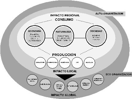 Figura 7. Modelización sistémica de los impactos locales, regionales y globales en el consumo y la producción de objetos, considerando la ecología -subsistemas y macrosistemas- con la que interactúan.