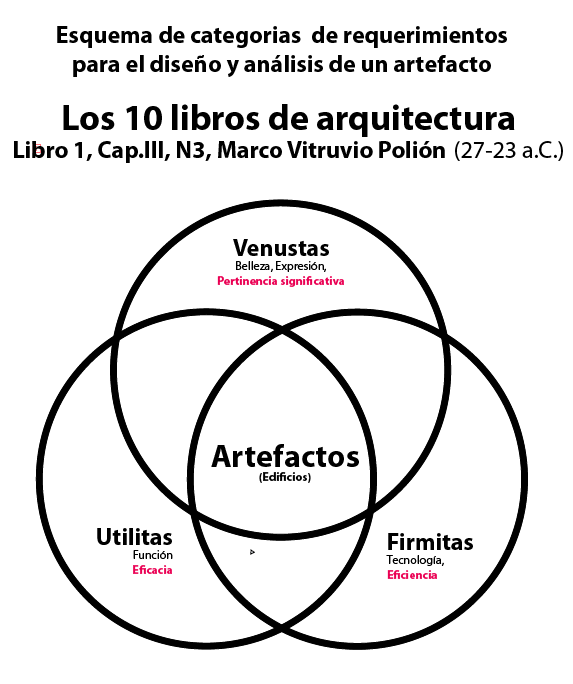 Visualización, Torres Maya, 2018.Todo artefacto en cualquier época y cultura es analizable de acuerdo a este diagrama. En la cultura contemporánea, los requerimientos de sostenibilidad son un nuevo aspecto a atender en la categoría de Firmitas, de eficiencia tecnológica que obedece a nuevas nociones de lo filosófico, sagrado y ético en la cultura.