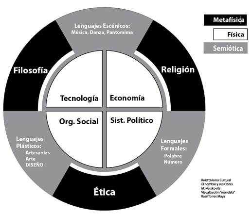 Como instrumento para observar, describir, analizar y cuestionar los cambios que se van haciendo evidentes en la emergencia de un nuevo modelo cultural, se ha desarrollado un gráfico, un mandala, en el que se visualizan las diez categorías, propuestas por Heskovits (1995: 30-31) La postura de este autor es reconocida, en su medio, como la teoría del relativismo cultural que se basa en la paradoja de que las categorías que propone siempre son identificables en cualquier cultura pero, paradójicamente, su práctica nunca es igual entre una y otra, siempre es particular, de acuerdo con las contingencias en las que se encuentra cada una.