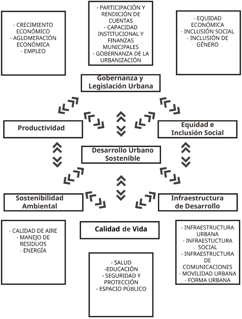 El Desarrollo Sostenible es uno de los componentes principales sobre el cual se sostiene el Índice de Ciudades Prósperas (Yigitcanlar, Dur y Dizdaroglu, 2015), a su vez el desarrollo urbano sostenible es uno de los principales paradigmas a los que se enfrentan las ciudades del siglo XXI. El Índice de Ciudades Prósperas (CPI, por sus siglas en inglés) es un marco de trabajo, cuya medición puede dar indicadores de los factores que son posibles mejorar en las ciudades, los cuales están basados en más de 40 indicadores (INFONAVIT) (ONU-Hábitat, INFONAVITy SEDATU, 2019). La figura 1 hace referencia a los distintos componentes del Desarrollo Urbano Sostenible de acuerdo con el CPI, es importante reconocer que todas sus partes entran en tres estructuras importantes, el medio ambiente, lo social y lo económico.