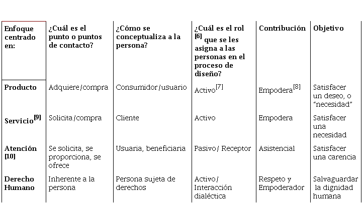 El planteamiento que realizamos, para considerar los Derechos Humanos, implica un cambio en el proceso de diseño, los resultados, sin embargo, pueden estar asociados al desarrollo de productos, servicios o artefactos. La tabla 1 presenta una comparación de las cinco dimensiones que proponemos.