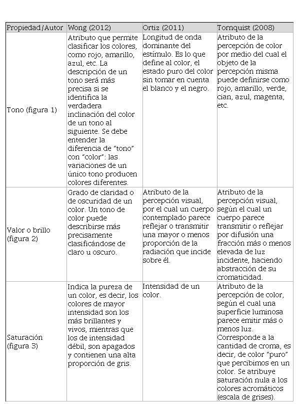 Para definir mejor el tema se han tomado las definiciones de Wong (2012), Ortiz (2011) y Tronsquit (2008), quienes explican estas propiedades, en general ellos las refieren como atributos perceptuales mesurables y en la tabla 2 son comparadas entre sí.