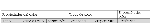 Esta propuesta de instrumento descriptivo de color tiene tres áreas generales: propiedades, tipos y expresión; que a su vez se subdividen en seis puntos para describir el tono, el valor, la saturación, la tonalidad, la temperatura y la semántica (tabla 1). A continuación, se describen cada una de ellas:
