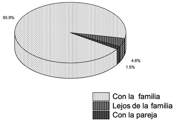 El análisis a los datos obtenidos arrojó los siguientes resultados: la media del avance crediticio de los estudiantes que respondieron el cuestionario era del 50.00%, repitiendo con mayor frecuencia contar con un avance del 12.00%, con una desviación estándar respecto a la media del 37.83%. El 93.9% vivían con su familia durante la contingencia y el resto permanecía lejos de ellos o con su pareja (figura 1). Al solicitar que categorizaran las razones que les permitieron enfrentar el trabajo virtual, en primer lugar eligieron la iniciativa personal y motivación, seguida en jerarquía por el apoyo familiar, el contar con recursos económicos, el apoyo de sus amigos, el dominio de las TICs, y finalmente, el apoyo de la novia(o) o pareja.