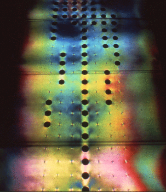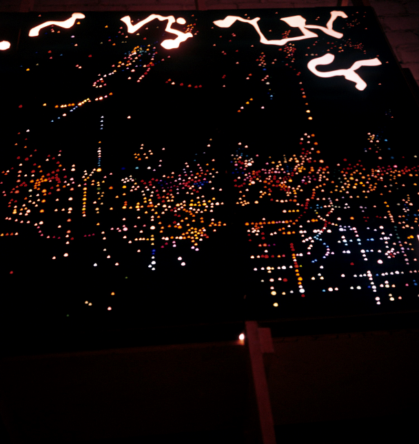 Kepes, con el fin de respaldar la realidad dinámica de la sociedad, basó sus esfuerzos en la consecución de nuevos modos ópticos de observar el mundo físico. Siguiendo con sus experimentaciones sobre la luz, uno de los proyectos que teorizaría –y sería aplicable a menor escala– la dimensión de la misma como elemento interactivo fue un plan ideado en conjunto con el arquitecto William Wainright llamada Photoelastic walk, una instalación presentada en Explorations[5] en donde se utilizaría tecnología de sensores, los cuales, ante la pisada del público, encendiera luces fluorescentes bajo sus pies de manera cromática. Una forma de hacer interactiva la obra con el público proporcionando un intercambio simbólico de la participación humana y el arte. Un experimento “photoelástico” que tendría cabida hipotética en aceras de la superficie urbana, una utopía de Kepes relacionada con la expansión del arte en la cotidianidad (Quiroga Fernández, 2015).