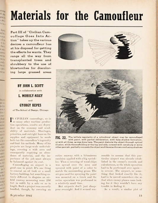 Ambos trabajaron con el ejército utilizando una utopía ambiental en pro de una especie de camuflaje civil estudiando los mapas de Chicago; la ciudad en donde radicaba en aquel entonces. Tomando ideas del arte medioambiental, desarrolló un plan en el que preveía colocar una gran red de cables y luces sobre el lago Michigan, para que, de esa forma, desde el aire, la fuerza aérea enemiga se confundiera pensando que la ciudad se extendía aún más, haciendo que bombardeara esa parte inhabitada. De esta manera, Kepes propuso una especie de ilusión óptica utilizando los estudios hechos por la Gestalt[4] sobre la percepción (Kepes & Supovitz, 1978).