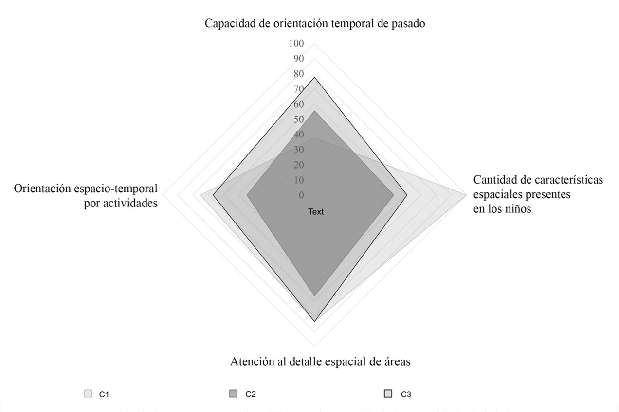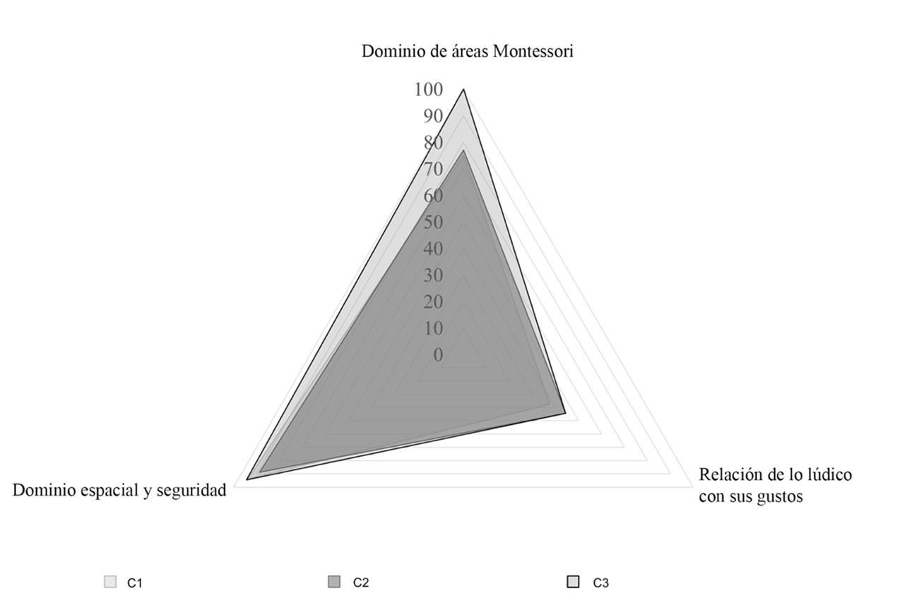 Cuando las niñas y los niños describen las características físicas de su ambiente, quienes captan mayormente su atención son las pertenecientes al sistema Montessori, en particular el mobiliario especial y su distribución. Por lo tanto, es posible afirmar que entre más características de este tipo posea el ambiente, más desarrollada será la orientación espaciotemporal. Esto se debe a que la percepción del entorno se enriquece por la incorporación de elementos diseñados para impulsar su entendimiento del concepto espacio-tiempo. Lo anterior se aprecia en la figura 2 a través de los resultados del colegio C1.