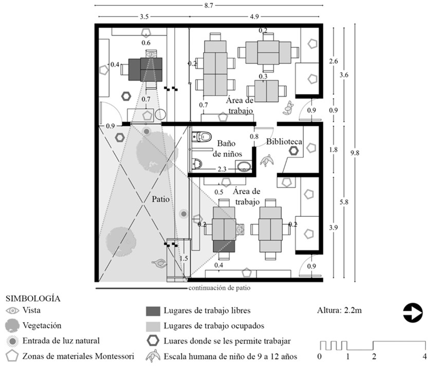 Recientemente se han establecido los 28 patrones arquitectónicos Montessori para guiar el diseño y la rehabilitación de espacios para entornos bajo este modelo educativo (Lawrence y Stæhli, 2018). A continuación, estos patrones se sintetizan mediante las tres categorías de estudio, consciencia, apropiación y juego como elementos mínimos fundamentales para determinar la congruencia entre espacios arquitectónicos adaptados y el sistema Montessori: I) jerarquía de espacios interconectados (conocimiento del entorno, orientación espaciotemporal y la seguridad que brinda esta estructura); II) articulación de lugares (creación de islas de concentración y atención); III) accesibilidad (contacto directo de estudiantes con los materiales de trabajo y manipulación autónoma de mobiliario); IV) observación sin intromisión (desarrollo de autonomía y privacidad mediante espacios que permitan que el estudiante se resguarde, idea contraria al panóptico); V) la importancia de la luz natural para el desarrollo de toda actividad; VI) uso de los sanitarios como parte de la educación (ejercicio de privacidad y autonomía); VII) conexión entre interior y exterior (posibilidad de extender el aprendizaje fuera del aula); VIII) el rol del entorno educativo como hábitat de plantas y animales (promueve la apropiación y el apego al espacio arquitectónico); IX) flexibilidad para reorganizar el mobiliario (principio fundamental de autonomía en que se basa el modelo Montessori para brindar libertad de elección y que las niñas y los niños trabajen en donde deseen); X) mantenimiento autónomo de los talleres (mediante la producción propia de materiales siguiendo los principios del entorno preparado Montessori).