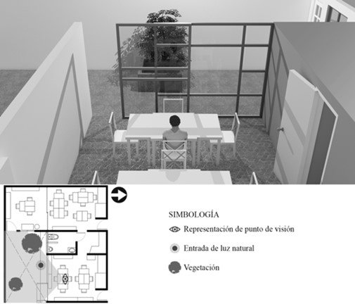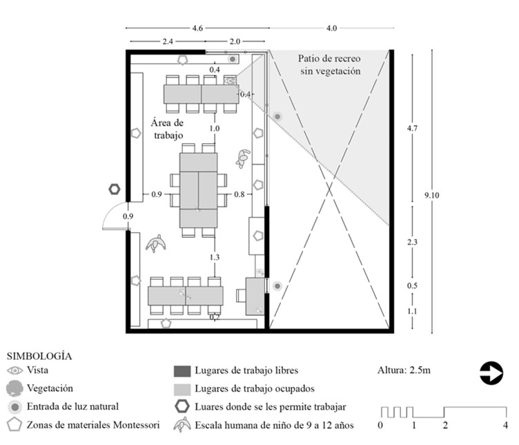 El otorgar en la niñez la opción de elegir diariamente su lugar de trabajo crea vínculos más estrechos con el espacio. Por lo que es indispensable darles la oportunidad de tomar decisiones, según sus gustos y preferencias para estimular el nivel de consciencia y “el sentido de apropiación desde la libre elección” (Montessori, 1986:190). La opinión de una alumna de Colegio C1 de sexto de primaria y la representación gráfica en la figura 4, soportan lo anterior: “Me siento relajada, tengo aquí los árboles, tengo las plantas, puedo ver todo. Además, aquí da muy bien el sol”. Cabe mencionar que este lugar de trabajo es buscado por varias niñas y niños, lo cual se debe a las cualidades espaciales que ellos mismos valoran. Esto comprueba la importancia de aplicar dos de los patrones arquitectónicos Montessori: I) el rol del entorno educativo como hábitat de plantas y animales; II) la importancia de la luz natural para el desarrollo de sus actividades.