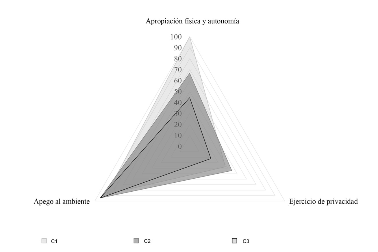 Más allá, se encontró que cuando pueden elegir diariamente su lugar de trabajo existe una diferencia significativa del nivel de apropiación. Esta opción se presenta únicamente en el colegio C1 y, por lo tanto, como se observa en la figura 5, el 100% describen como suyo algún lugar en el ambiente; situación que no sucede en los otros dos casos, donde los lugares les son asignados. Desde la filosofía Montessori, la cual promueve la autonomía y libre elección mediante los patrones arquitectónicos de accesibilidad y flexibilidad para reorganizar el mobiliario, se corrobora un sentido de apego más estrecho con la arquitectura a partir de la forma en que se les permite habitar el espacio-tiempo.