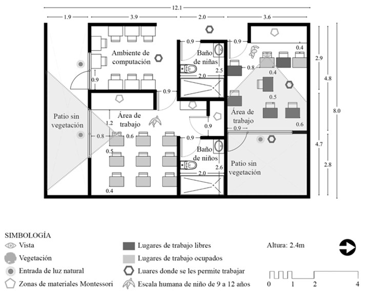 Con relación al dimensionamiento, el colegio C3 fue en el único que niñas y niños describieron a su ambiente como amontonado, lo cual demuestra que la ausencia de los patrones arquitectónicos de articulación de lugares y observación sin intromisión afecta considerablemente su grado de autonomía. Lo perciben de esta manera debido a la distribución de los escritorios de trabajo, el espacio entre ellos y áreas destinadas a las zonas (figura 3). Los metros cuadrados por estudiante recomendados por la AMI (2009) son 3.71 m2, mientras que este colegio cuenta únicamente con 1.67 m2 por estudiante. Por lo que se afirma que el dimensionamiento influye directamente en su grado de atención. Además, la falta de espacio dentro del ambiente se relaciona con un bajo nivel de privacidad, principio fundamental para el óptimo desarrollo en la niñez propuesto por el modelo Montessori.
