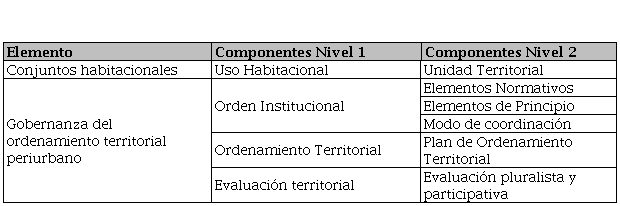 En forma de síntesis se presentan los componentes teóricos de la gobernanza del ordenamiento territorial periurbano y los elementos de los Conjuntos Habitacionales.