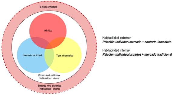 Así, la habitabilidad al ser considerada multifactorial o multidimensional se estudia desde sus niveles sistémicos, donde se presenta, en primera instancia, el nivel sistémico primario como el nexo que establece el individuo o usuarios con el espacio del mercado tradicional, considerado como habitabilidad interna; mientras que el nivel sistémico secundario es definido por la correlación existente entre el primer nivel y su entorno inmediato, determinado como habitabilidad externa (figura 2).