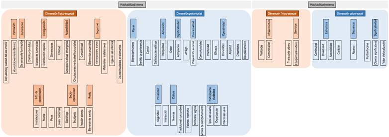 Es entonces que, a partir de una fase introductoria donde se propone una investigación documental, se realiza la formulación de constructos,[3] que son estudiados mediante la realización de levantamientos fotográficos y mapeos como parte de un análisis físico, espacial, formal y constructivo; además de la aplicación de instrumentos como encuestas y entrevistas semiestructuradas, con la finalidad de obtener datos relevantes en torno a la percepción y las relaciones de los usuarios con el espacio del mercado tradicional. La determinación de los constructos se categoriza de acuerdo con los niveles sistémicos que fueron propuestos para la investigación: nivel primario (habitabilidad interna) y nivel secundario (habitabilidad externa) (figura 3); cada una de estas comprende dos grandes rubros: la dimensión físico-espacial y la dimensión psicosocial, la primera expone los factores objetivos del mercado tradicional potencialmente cuantificables que impactan en el aspecto funcional del individuo; mientras que el segundo se refiere a las transacciones psicológicas que se originan de la relación del individuo y su entorno.