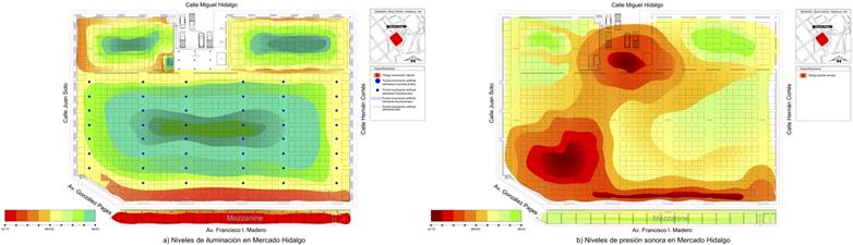 · Placer-Socio operatividad: La apreciación es mayoritariamente negativa al reconocer la falta y necesidad de establecer espacios de descanso y convivencia que sirvan de aliciente al mercado, donde se fortalezca la comunidad y el sentido identitario; siendo un factor de oportunidad para áreas semi desiertas y evitar la concentración de personas únicamente en ciertas zonas, pues el mercado presenta una importante afluencia, principalmente en la zona de cocinas, donde se exponen altos índices de presión sonora (70dBS hasta 83dBs aprox.) (figura 5b), determinado por Arqué (2018) como un ambiente ruidoso, molesto y agitado, y que al permanecer en estas condiciones durante más de 8 horas al día, los individuos pueden presentar a largo plazo afectaciones en la salud.