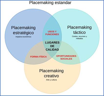 El Placemaking es un concepto que busca mejorar las condiciones de los espacios sin menospreciar su escala. Su aportación es una mirada participativa como base de la transformación, lo que le da identidad y pertinencia. El Placemaking involucra todo un proceso de codiseño que va desde la planificación, el diseño, la gestión y desarrollo de los espacios públicos, pero fundamentado en la toma de decisiones participativa (Barrientos Barría, 2012).