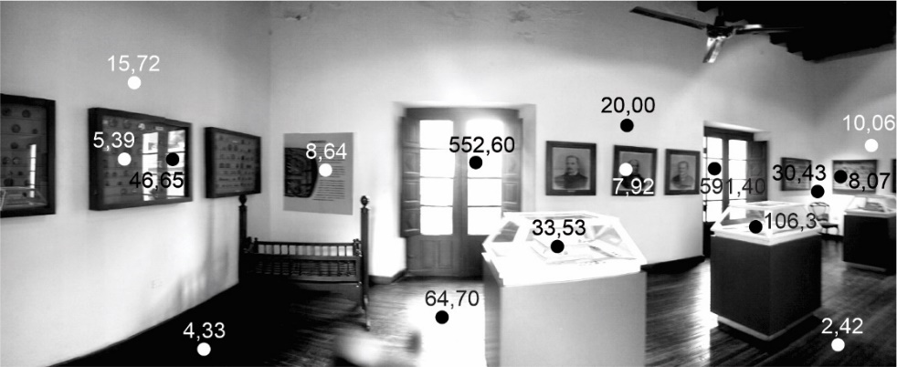 · Las salas 3, 5, 6, 8 y 9, con un rango de luminancias de 2-30 cd/m2 con algunos valores mayores en el orden de las 550-700 cd/m2 en la sala 8 y de 1200 cd/m2 en la sala 9 debido a la presencia de luz natural. En la sala 8 se presentaron además reflejos en vitrinas o el suelo de entre 46-106 cd/m2 (figura 5). En cuanto a las iluminancias, el rango fue similar al primer grupo, de 15-280 lx con algunos puntos aislados de mayor valor en las salas de la PA en el orden de los 500-600 lx por ingreso de luz natural. En la sala 3 se encontraron valores menores, con un rango de 9-121 lx.