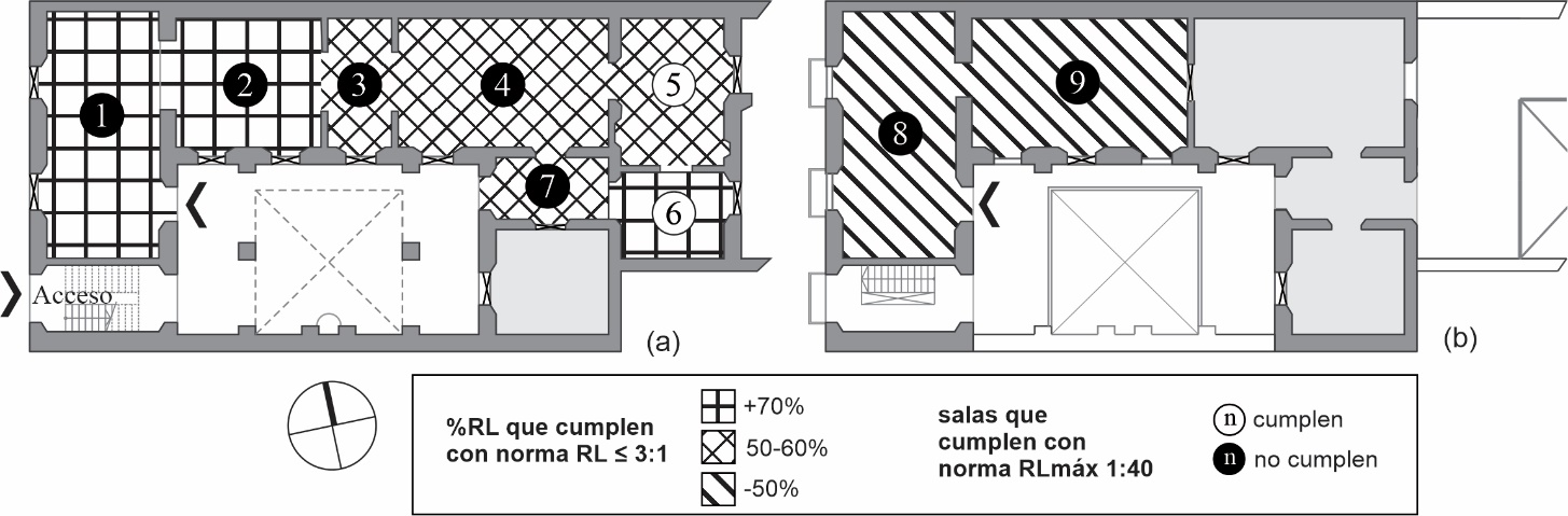 · Por último, las salas 8 y 9 en PA, donde sólo 33-45% de las relaciones cumplía con la normativa. En este último grupo, algunas de las relaciones llegan a alcanzar valores particularmente altos: 90:1 en la sala 8 y de 157:1 en la sala 9.