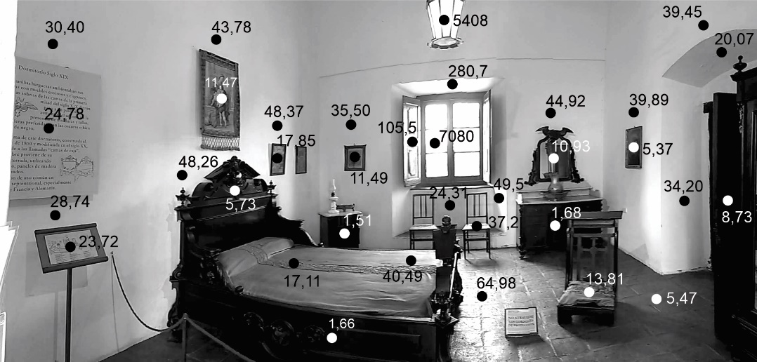· Distribución de luminancias medidas sobre objetos y entorno: 1 punto de medición por cada objeto sumado a puntos de medición en el entorno cercano a cada objeto cubriendo las superficies verticales de la envolvente edilicia más piso y aberturas, así como reflejos y manchas de luz que pudieran apreciarse.