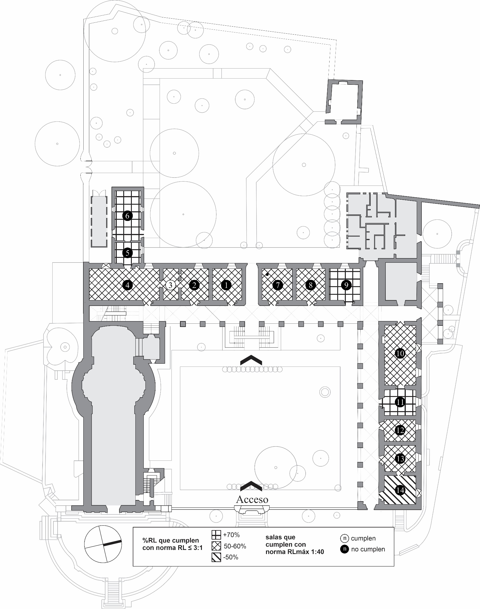 Respecto a las RL (figura 8, tabla 6), en 9 de las 14 salas más del 70% de las relaciones cumplía con la normativa (≤ 3:1), mientras que, en las 5 salas restantes, este porcentaje fue entre el 40-60%, a excepción de la sala 14, que cumplió sólo en un 30% de sus relaciones.
