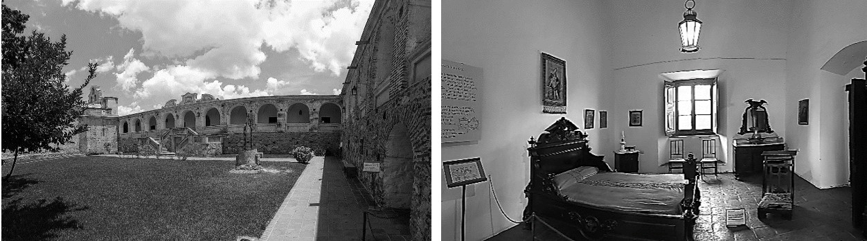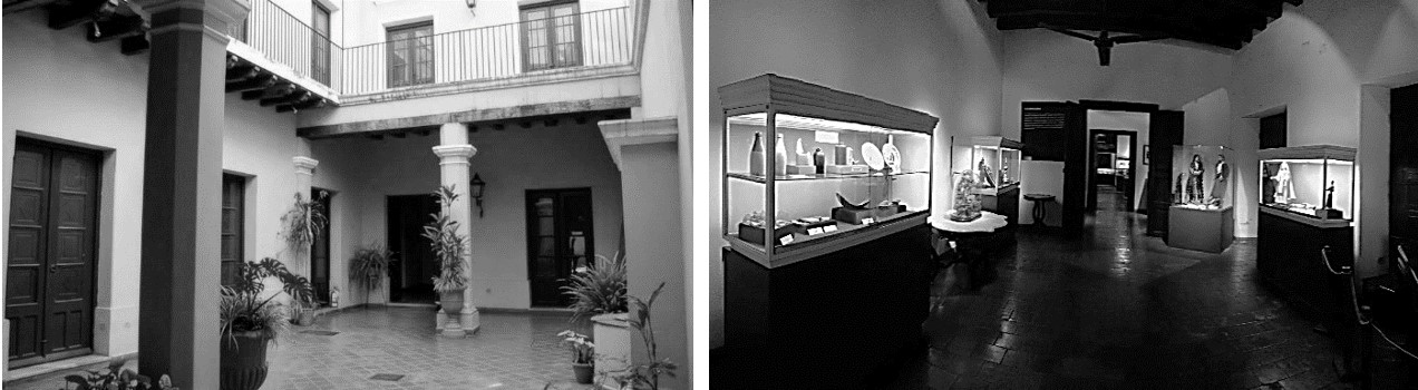Museo Nacional Estancia Jesuítica de Alta Gracia y Casa del Virrey Liniers, en Alta Gracia, Córdoba (MEJAG) – El museo cuenta con 14 salas dispuestas en dos alas configuradas en L en torno a un patio. Cada ala se compone de una galería a la que abren todas las salas, que en muchos casos no tienen comunicación entre sí, de manera que durante su recorrido el visitante debe salir a la galería para ingresar a la siguiente sala (figura 2). La puerta de acceso a cada sala desde galería se encuentra permanentemente abierta, por lo que ésta y una ventana, ubicada de forma enfrentada en la pared opuesta, funcionan como accesos de luz natural en casi la totalidad de las salas. La luz artificial funciona como un complemento de la luz natural; en 9 de las 14 salas es de tipo general con una única luminaria ubicada de manera central (figura 2), en las restantes se utiliza una iluminación puntual de tipo spot con lámparas AR111 halógenas. Las salas 3 y 10 cuentan con vitrinas autoiluminadas. El acabado en paredes y techo es rugoso, color blanco, con una reflectancia aproximada del 85%. Los pisos tienen un acabado rugoso color terracota, con una reflectancia del 30%.