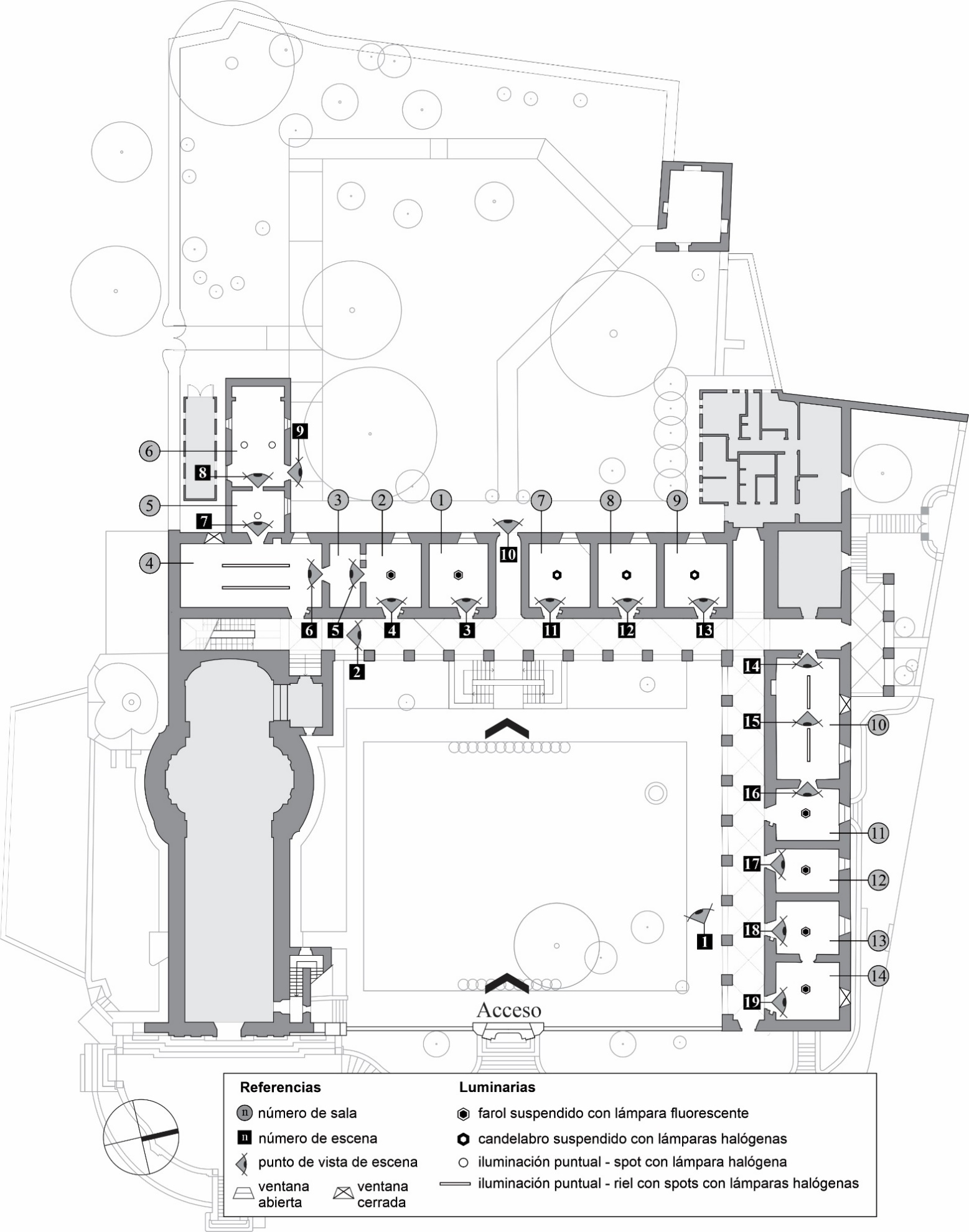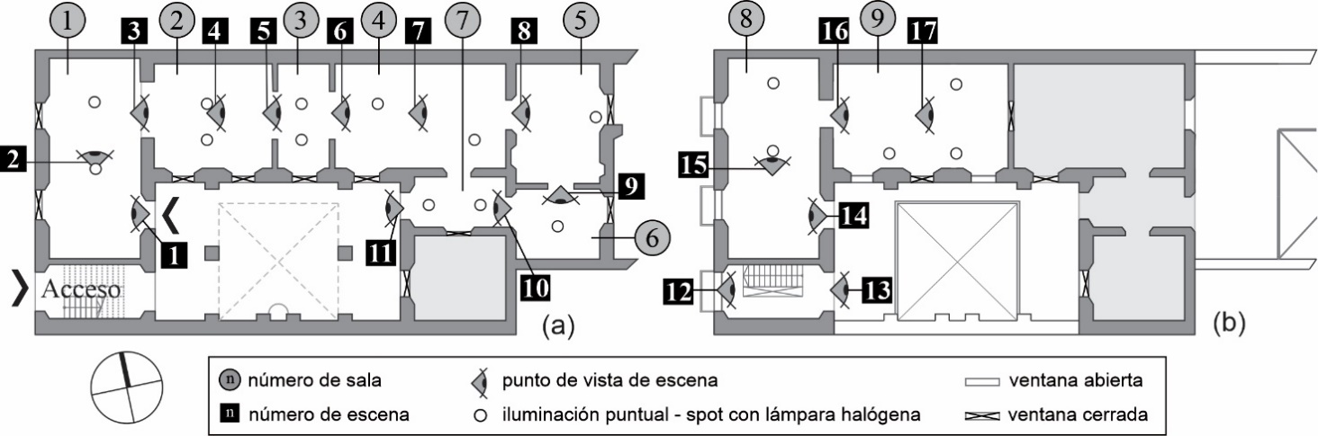 Dado que la luminancia varía según la posición del individuo en relación a los objetos o superficies observadas y la fuente de luz, las mediciones se realizaron con base en una propuesta metodológica de selección de escenas clave a lo largo del recorrido. Esto permite conseguir, mediante el análisis de los datos fotométricos del conjunto de escenas, una imagen integral de la experiencia visual a través de las salas.