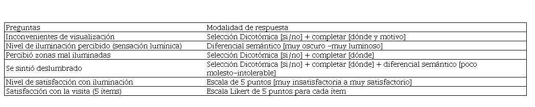 Las preguntas de información sociodemográfica incluyeron: edad, género, ocupación y nivel de estudios. La satisfacción con la visita se midió mediante una escala de cinco ítems adaptada de bibliografía relevante (De Rojas & Camarero, 2008), mientras que las variables relacionadas a la iluminación con preguntas elaboradas en el marco del presente trabajo. La iluminación se evaluó de forma general, por lo que las preguntas incluidas hacen referencia al museo en su totalidad (tabla 2).