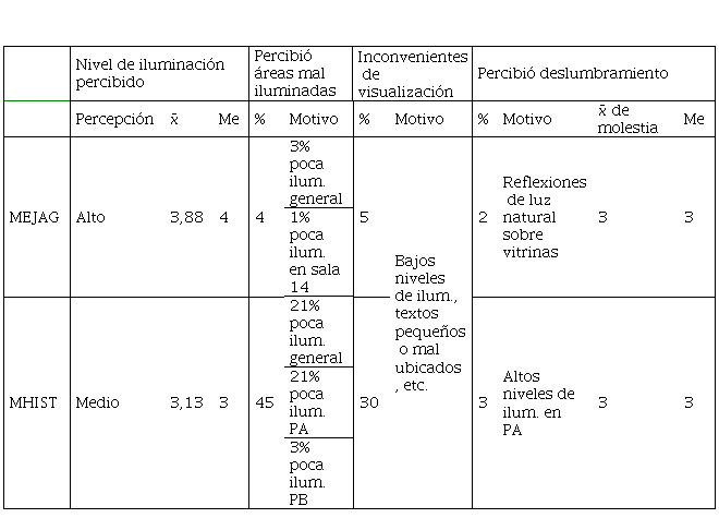La tabla 3 presenta los resultados de iluminación del cuestionario en ambos museos.