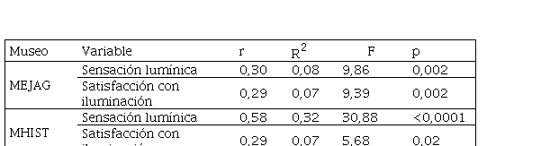 Mediante análisis de regresión simple con la satisfacción global como variable dependiente se confirmó su correlación representativa con la sensación lumínica y con la satisfacción con la iluminación en ambos museos. En MEJAG la sensación lumínica resultó significativa en la formación de la satisfacción global (p=0,002), presentando una correlación (r) del 30% y explicando el 8% de la varianza de la satisfacción global (R2); en el caso de la satisfacción con la iluminación la significancia (p) fue también de 0,002, la correlación fue del 29%, explicando un 7% de la varianza. En misht, por otro lado, la sensación lumínica resultó significativa con un p<0,0001, con un alto nivel de correlación con la satisfacción global (58%), explicando un 32% de su varianza; mientras que la satisfacción con la iluminación, resultó significativa, pero en menor medida (p=0,02), con una correlación del 29%, explicando un 7% de la varianza total de la satisfacción global (tabla 4).