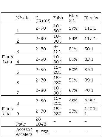 Si se comparan las condiciones generales de iluminación entre ambas plantas, se observan rangos similares de E en casi todas las salas y los niveles de L medidos variaron sólo en un rango aproximado de 30 cd/m2 entre salas. Las relaciones entre luminancias, por otro lado, si presentan diferencias. En PA sólo el 45% (sala 8) y 33% (sala 9) de estas relaciones cumplieron con la normativa (≤ 3:1). En contrapartida, la PB cumple con la normativa en al menos el 50% de las relaciones en todas sus salas. Si bien las RLmáx no se cumplen en la mayoría de las salas, las dos de PA presentan las RLmáx que más se alejan de los valores recomendados. En síntesis, en las salas de PB hay mayor cantidad de contrastes recomendados figura-fondo u objeto-entorno que en las de PA.