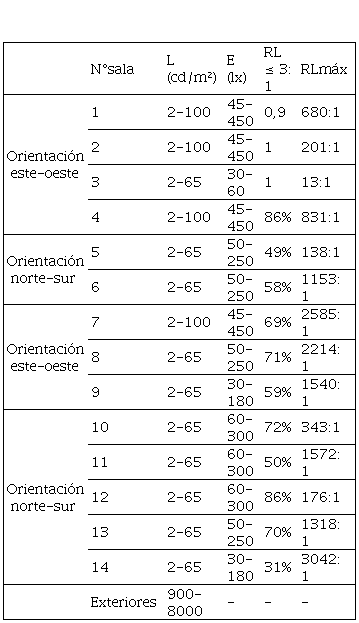 · Las salas 1, 2, 4 y 7, de orientación este-oeste, presentaron valores superiores tanto de luminancia como iluminancia. El rango de luminancias medidas fue de 2-100 cd/m2 y de iluminancias sobre objetos de 45-450 lx.