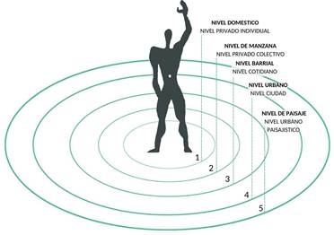 Desde esta vertiente, autores como Landázuri & Mercado (2004: 89-113) y Hernández & Velásquez (2014: 149-200) puntualizan que la habitabilidad debe estudiarse a través de sus escalas o niveles sistémicos. La figura 1 muestra que dichas escalas o niveles pueden expresarse en cinco esferas proxémicas, donde la habitabilidad interna será conformada por el nivel sistémico primario, mientras que el resto de las esferas referirán a la habitabilidad urbana en relación directa con un colectivo, ya sea a nivel manzana, barrial, urbano y/o de paisaje.