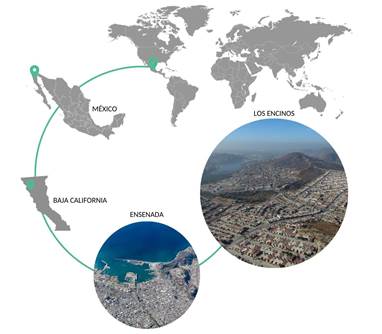 Los criterios para la selección del sitio de estudio fueron referentes a su construcción, se buscó que el mismo se ubicara inmediato a espacios con alto valor de representatividad en la región, su localización en la ciudad (fuera de la mancha urbana al momento de su edificación), características físicas (urbanizador, clave catastral, año de construcción, tipo de fraccionamiento, superficie del polígono en metros cuadrados, lote, total de manzanas, total de viviendas, población, etc.) y finalmente, que refleje la oferta pública y privada de vivienda de la cual surgió. Tal como se muestra en la figura 2, la unidad de análisis corresponde a Los Encinos, un fraccionamiento ubicado al norte y al borde de la ciudad de Ensenada, B. C., México.