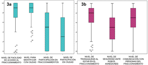 En este caso de estudio, los habitantes evidencian un nivel de identidad favorable con cuartiles más compactos (figura 3a), que el resto de las variables analizadas, lo que refiere a un mayor número de coincidencias en la evaluación positiva. Este hecho invita a la reflexión sobre el nivel y/o tipo de identidad que los habitantes pudieran generar y/o construir con los lugares en el fraccionamiento y en la ciudad. En este sentido, la apreciación del habitante sustenta una supuesta identidad del self entendida como la observación introspectiva de cada persona, sin llegar a una identidad social urbana, pues la interacción con otros queda supeditada a la preferencia por el aislamiento en la vivienda y el escaso o nulo uso de espacios abiertos, lo que impide una construcción identitaria con el colectivo o con el lugar.