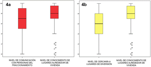 Este apartado continúa con una comparativa entre indicadores específicos que pudieran estar involucrados con el incremento de los niveles de habitabilidad y la conectividad con la ciudad. En este sentido, fue necesario realizar un panorama de las relaciones entre todas las variables involucradas para esta investigación y plantear vínculos estratégicos para la comprensión del fenómeno. Se muestran cuatro de los principales comparativos expuestos a través de gráficos de caja (boxplot). Dichos comparativos establecen el siguiente análisis de variables: a) Nivel de conocimiento con personas del fraccionamiento y nivel de conocimiento de lugares alrededor de vivienda; b) Nivel de tranquilidad al permanecer en el fraccionamiento, nivel de seguridad antes robos y agresiones, y nivel de comunicación con personas del fraccionamiento y; c) Nivel de cercanía a lugares de diversión y nivel de conocimiento con lugares alrededor de la vivienda.