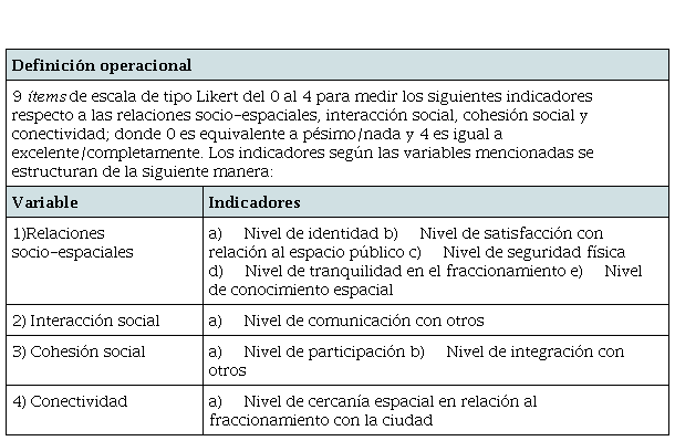El cuestionario es una herramienta de análisis que permite la estimación de la habitabilidad urbana en fraccionamientos de tipo social. A continuación se muestra la operacionalización de dichas variables de estudio que permiten delinear los resultados (tabla 1).