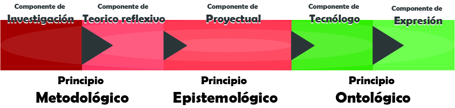 Por tal motivo, el proyecto integrador permite la observación y análisis de un conjunto de acciones predeterminadas que provee el aprendizaje y el acto de enseñar como en el componente o área de conocimiento institucional, donde se establecen desde las asignaturas investigativas e históricas, narrativa de objetivos y lineamientos bajo valores éticos, culturales, físicos, sociales y económicos que dictan una exploración de virtudes de la organización académica en la sociedad (figura 1). Por lo tanto, un análisis crítico en la producción de conocimiento y su estrecha relación con la historia y las teorías del diseño, el valor de hechos expuestos en el componente reflexión y teoría, donde interviene un diálogo constante en el “aprender haciendo” gracias al ejercicio del componente proyectual, como eje central de los talleres.