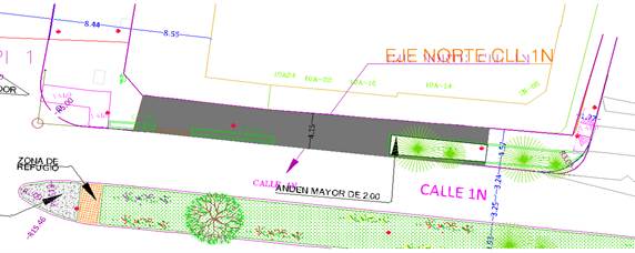 Solution: The plan includes the establishment of green areas intended for the planting of medium-sized trees, strategically positioned to offer shading. These spaces also function as verdant shields, enhancing pedestrian safety and augmenting user comfort along the roadway (figure 10).