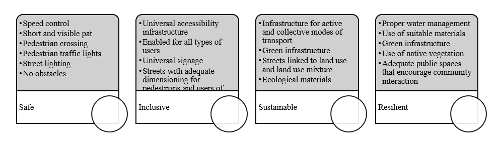 The value given in the evaluation is multiplied by the weight of each attribute and the sum is made for the entire street, determining the value achieved in each main attribute as a safe, inclusive, sustainable, and resilient street. To analyze the results, an assessment scale such as the one indicated in table 2 is proposed.