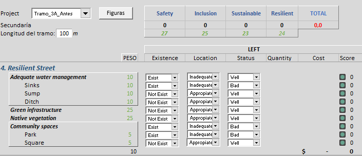 In essence, the realization of safety, inclusivity, sustainability, and resilience prerequisites harmoniously coalesce to furnish streets with genuine functionality. The onus lies on governmental bodies and urban developers to implement pragmatic solutions that align with the technical requisites of these attributes. Previously, it is imperative for each city to possess updated insights into public spaces, particularly commercial and residential activities occurring within the targeted areas. By doing so, and recognizing the budgetary limitations faced by many nations, governing bodies can judiciously employ the weighted sums method, integrated within platforms like Excel, to strategically plan the execution of interventions. This strategic case study exemplifies the method's application in the context of a street renovation project along the left bank in Popayan, illuminating a pathway toward enhancement and progress.