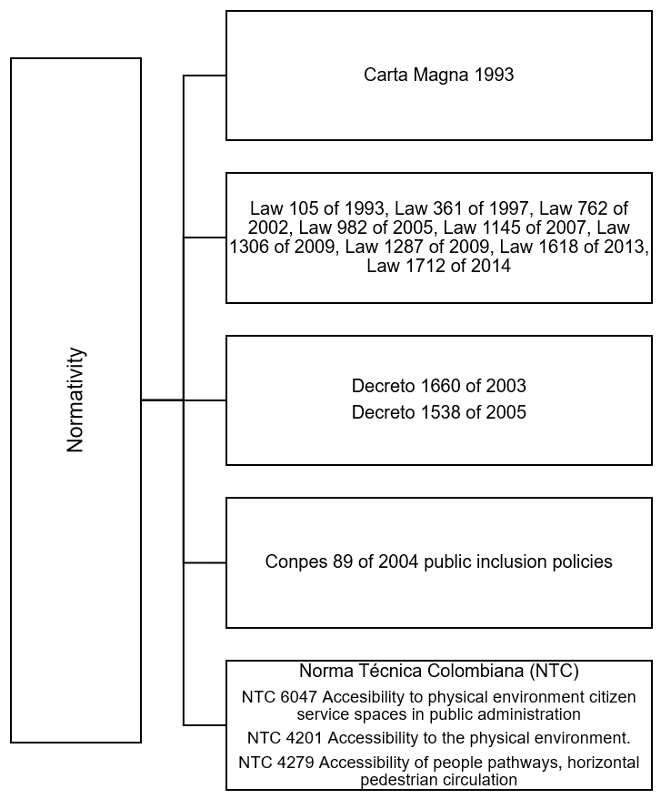In the case of Colombia, the Political Constitution, the country's Magna Carta, in its articles 13, 14, 54 and 68 defines the inclusion policies that must be contemplated at a national level. Part of this regulation is considered in accessibility adjustments (Serrano Guzmán, Pérez Ruíz, Jaimes Jiménez, Estupiñán Monroy & Torres Riascos, 2019) made explicit in laws, decrees and government documents (figure 2).