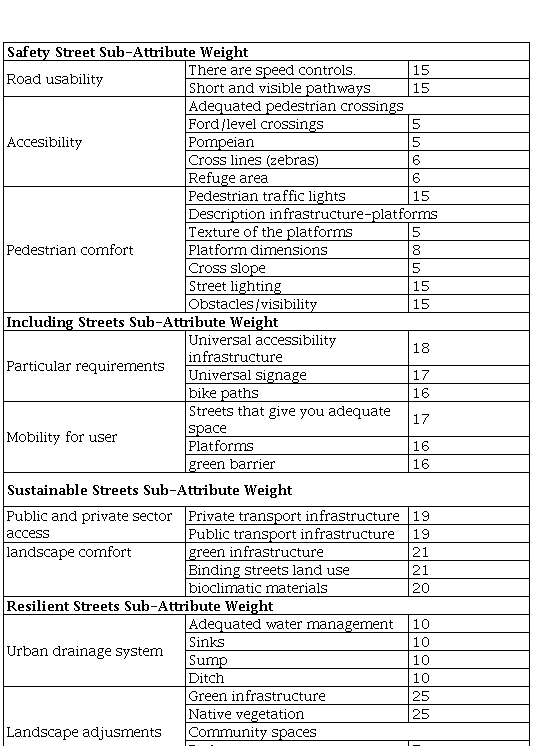 This study began with the review of complete street concepts and included in an Excel sheet considering the weighted sum method described in (Madathil, Pandi V, Nair & Jamasb, 2021) and (Dehghanmongabadi & Hoşkara , 2022). For doing this, a focus group made up of 33 experts 21 professionals belonging to RAM, the Academic Network for Mobility in Colombia for its acronym in spanish, composed of professors and researchers from disciplines related to mobility and transportation, along with five employees linked to the private sector and seven consultants who established the weights that should be assigned to the factors or attributes and the corresponding sub-attributes around safe, resilient, inclusive and sustainable street conditions. The collection of information was carried out through a tool developed in a digital form (Google Forms), which was available for a period of seven days. In this form, each participant could choose the order of importance that, in their opinion, the fulfillment of the complete street attributes on a road should have.