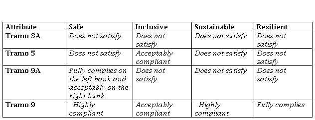 The qualitative assessment in the study area revealed the behavior depicted in table 3, which shows non-compliance with sustainability and resilience attributes in Sections 3A, 5, and 9A.