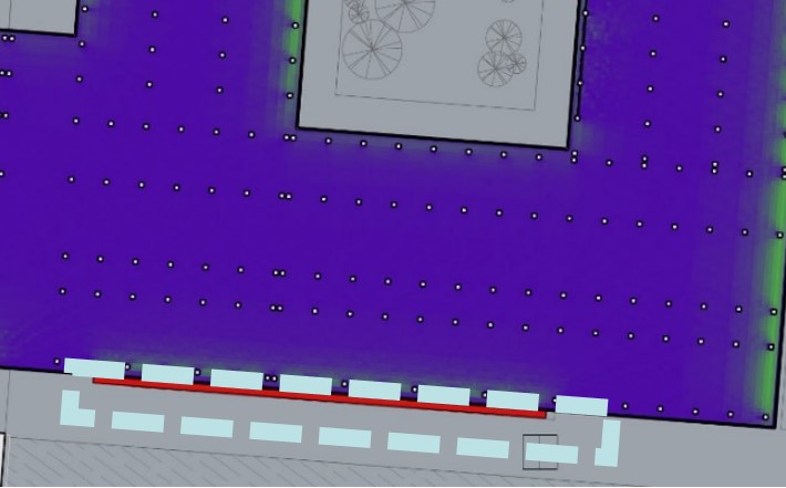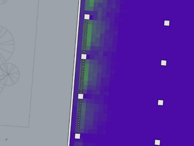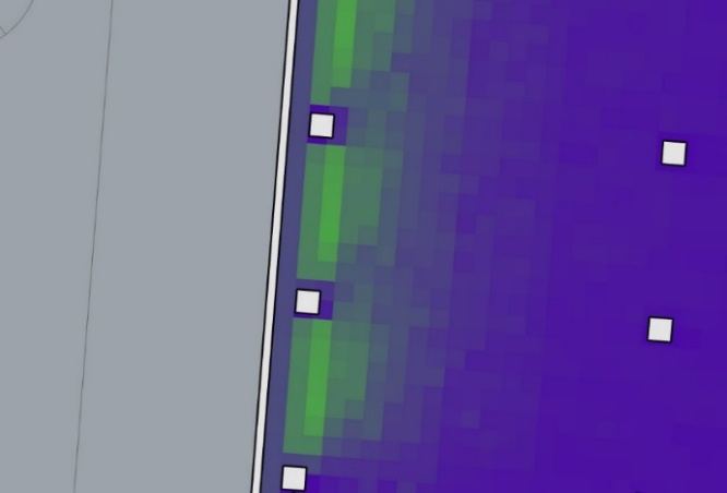 Con la finalidad de seguir en la línea de comparar lo actual con la propuesta, se realizaron análisis en Rhinoceros 7 (Robert McNeel & Associates, 2021) y Ladybug (Ladybug Tools, 2021) para calcular la cantidad de energía solar que recibe la losa en promedio al día. Se observa la radiación en verde en las zonas cercanas a las ventanas y en tonos azules y morados las zonas que menos reciben radiación.