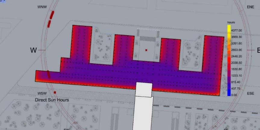 Algo importante a considerar son las afectaciones a la iluminación natural interior de los espacios. Utilizando las mismas herramientas, se obtuvieron gráficos de la iluminación natural durante el año con y sin las persianas giratorias, para analizar cuánto interfieren en la entrada de luz solar. En la figura 13 se puede observar las horas con luz natural en el estado actual. En la figura 14 se ven las horas con luz natural considerando los elementos de sombreado.
