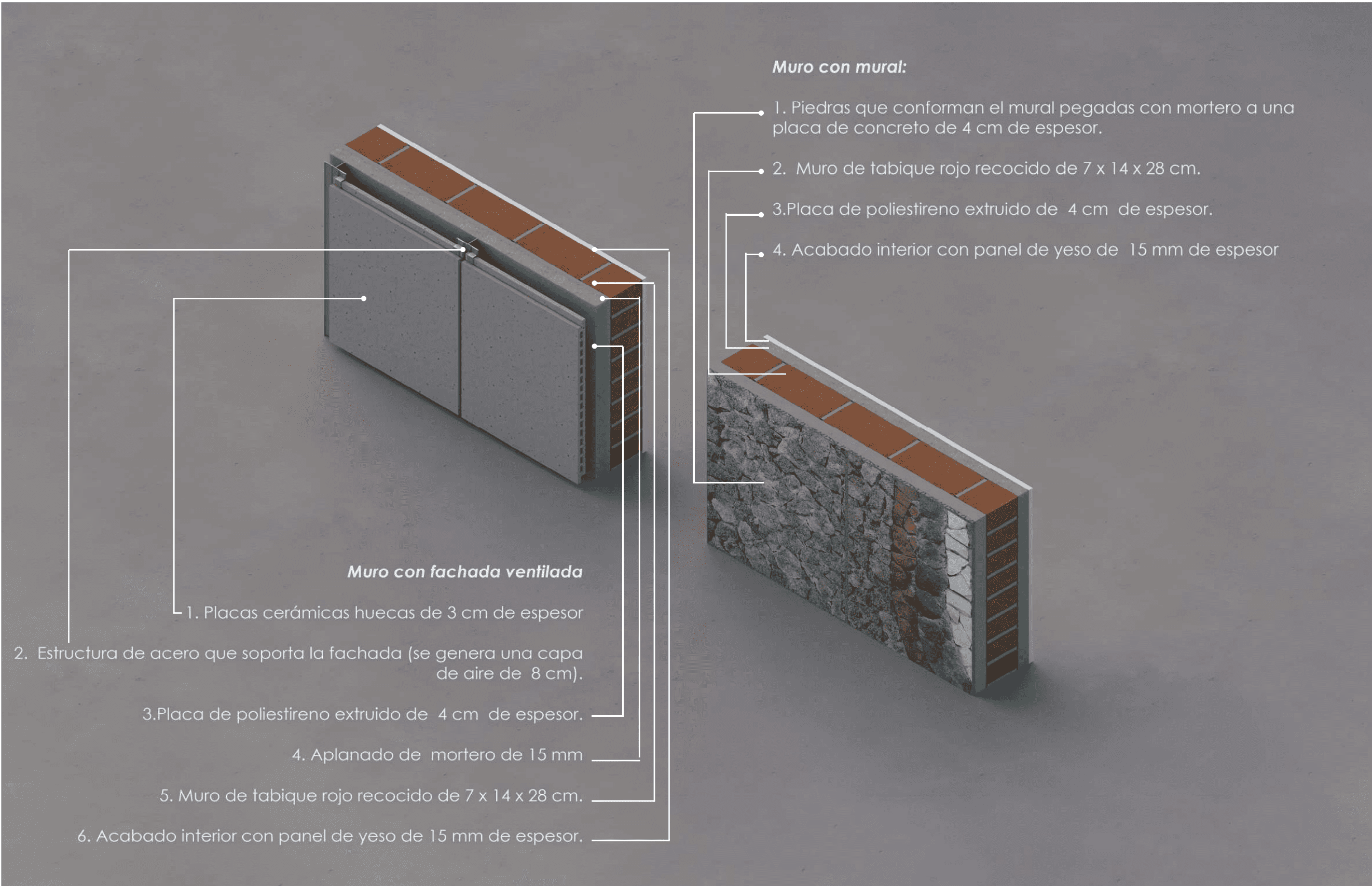 Para los muros en fachada que no tienen murales, se propone cambiar las placas de concreto ancladas actuales por una fachada ventilada con una apariencia similar a la actual. Se propone agregar al muro de tabique un aislamiento de polipropileno extruido y un acabado de panel de yeso, después se pone la estructura de acero para anclar el revestimiento y por último los paneles cerámicos. Se consideran solamente los valores de los materiales nuevos, que son el aislamiento, la placa de yeso y la fachada de paneles de cerámica. En tabla 3 se compara el muro actual con la propuesta.