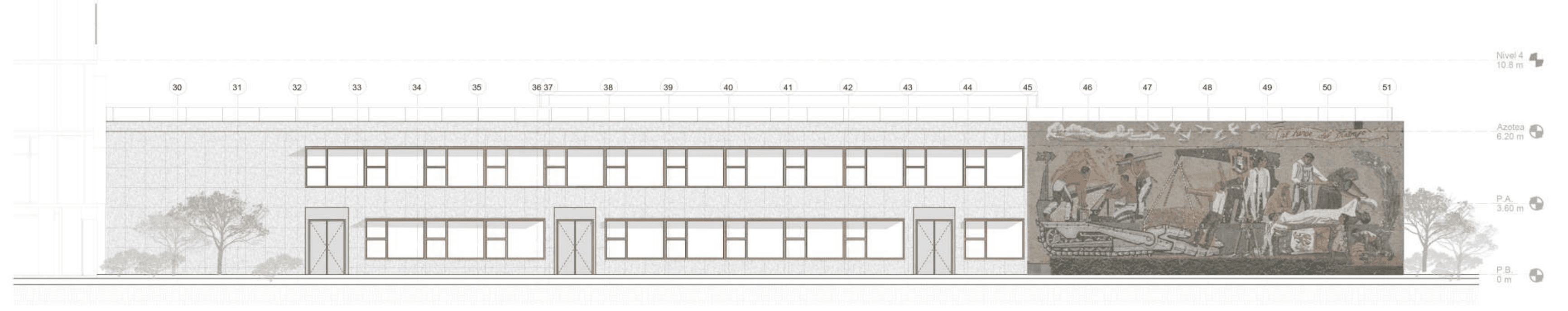 El edificio tiene dos tipos de muro en las fachadas. Uno es de tabique con una placa de concreto anclada en la parte exterior, el segundo es el mismo muro de tabique, pero en la placa tiene piedras que conforman los murales (figura 3).
