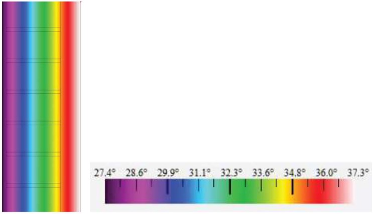 En el caso de la fachada poniente, se proponen persianas verticales giratorias, puestas al interior para no modificar la fachada. Con la finalidad de comparar el estado actual con la propuesta, se realizaron las siguientes simulaciones. En la figura 11 se muestra la radiación en la fachada oeste sin los elementos de sombreado. En la figura 12 se muestra la radiación con las persianas verticales giratorias de la propuesta en diferentes ángulos de inclinación (30°, 0° y 60° de la perpendicular al muro de fachada).